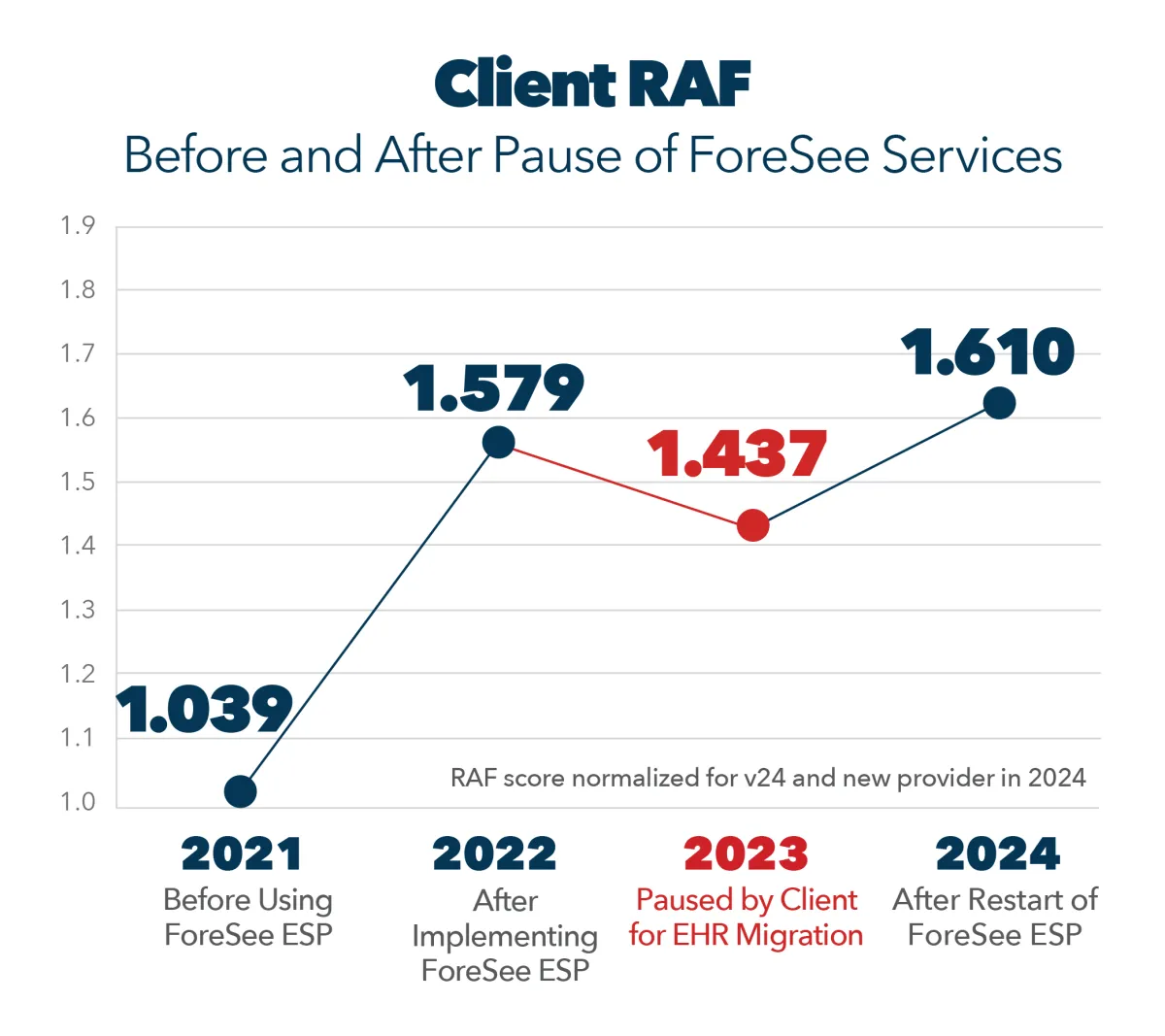 An analysis performed at the conclusion of the pause revealed a RAF score decline of 14.2 basis points. Without the use of ForeSee in 2023, the client relinquished some of the gains they achieved with ForeSee during the prior year.